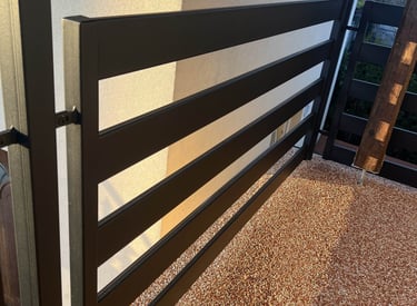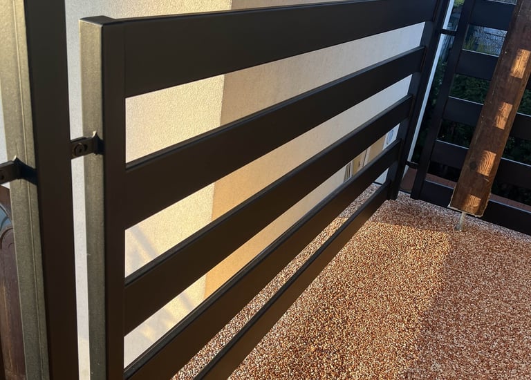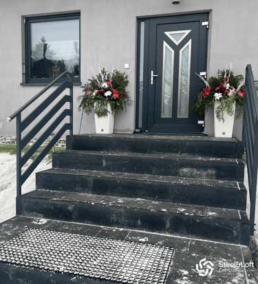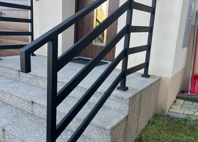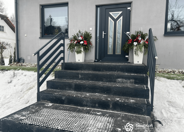 solidna i elegancka balustrada ze stali czarnej, malowana proszkowo. Trwale przymocowana do schodów i elewacji.